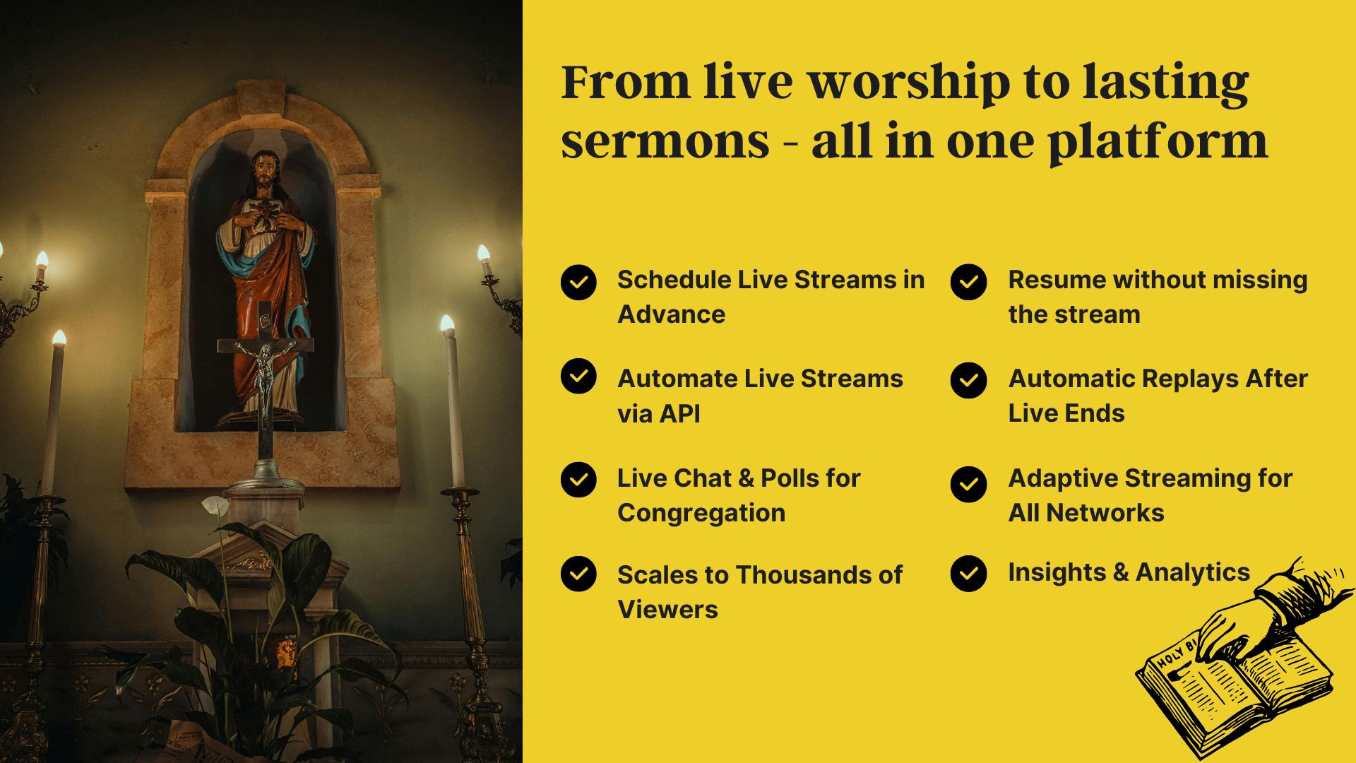 - Live + recorded sermons for later viewing