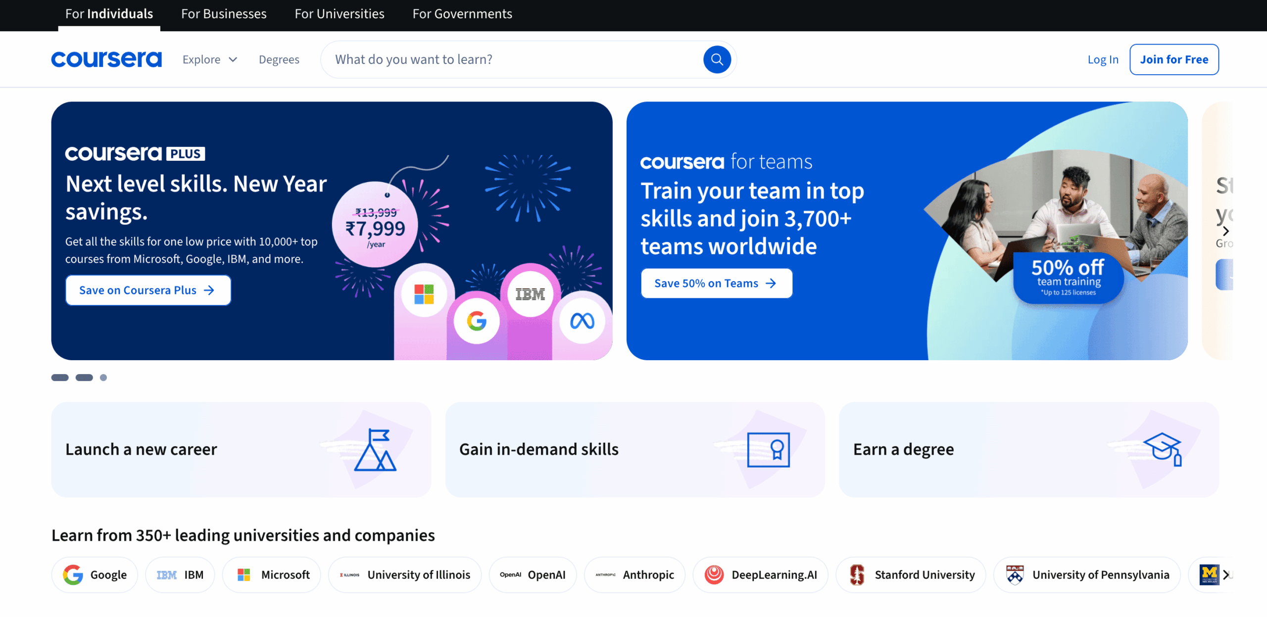 Coursera is the largest university-backed online learning platform in the world. It partners with more than 350 leading universities and companies to bring flexible, affordable, job-relevant online learning to individuals and organizations worldwide. Global companies such as Google, IBM, Meta, Microsoft and leading academic institutions to deliver structured programs, professional certificates and full online degrees. It offers a range of learning opportunities from hands-on projects and courses to job-ready certificates and degree programs.