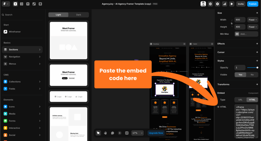 To embed video in Framer, press Cmd/Ctrl + K to open the insert menu, select “Embed” for YouTube/Vimeo videos, or go to Utility > Embed > HTML for video platforms like VdoCipher. Paste your video URL or embed code, resize the component, and you’re done. The entire process takes less than a minute.