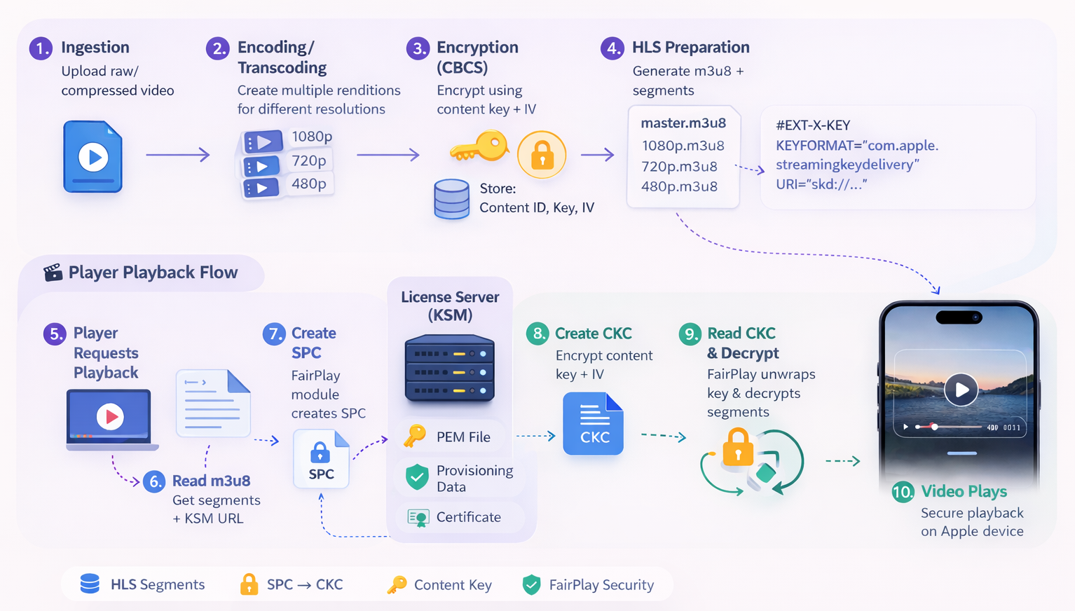 Apple FairPlay DRM is a multi-component system. On the content-provider side, the content key, IV, and content ID mapping are maintained in backend systems, while the KSM/license server handles the FairPlay playback transaction by processing SPC and generating CKC. Apple’s overview says the content provider manages the content key and IV database, and the KSM side uses this information during the key-delivery process.
