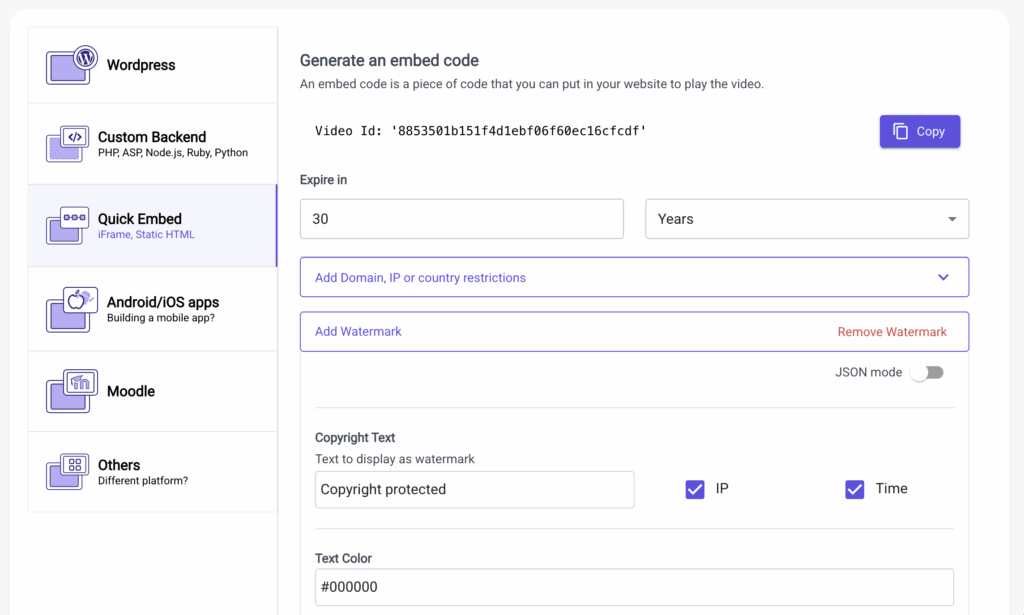 Click on the “Generate Embed Code” button once you’ve made all the settings. You will now have your embed code generated for you. Further, if you want more customization in the watermark, just mark the JSON mode checkbox and a JSON string will appear wherein you can make more customization.