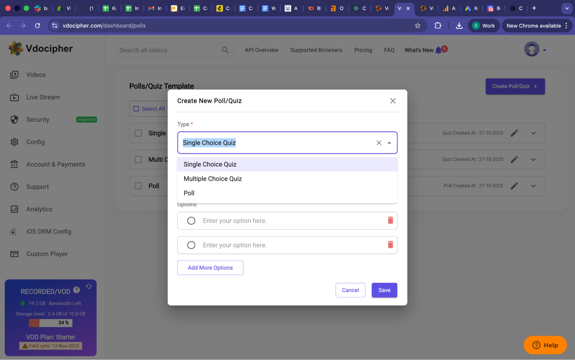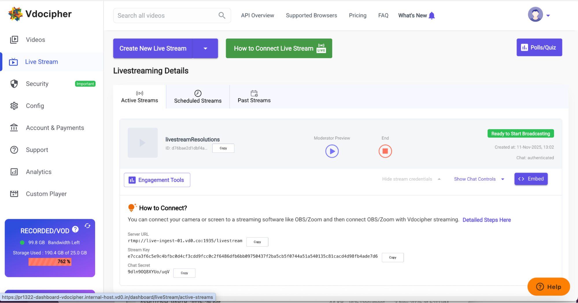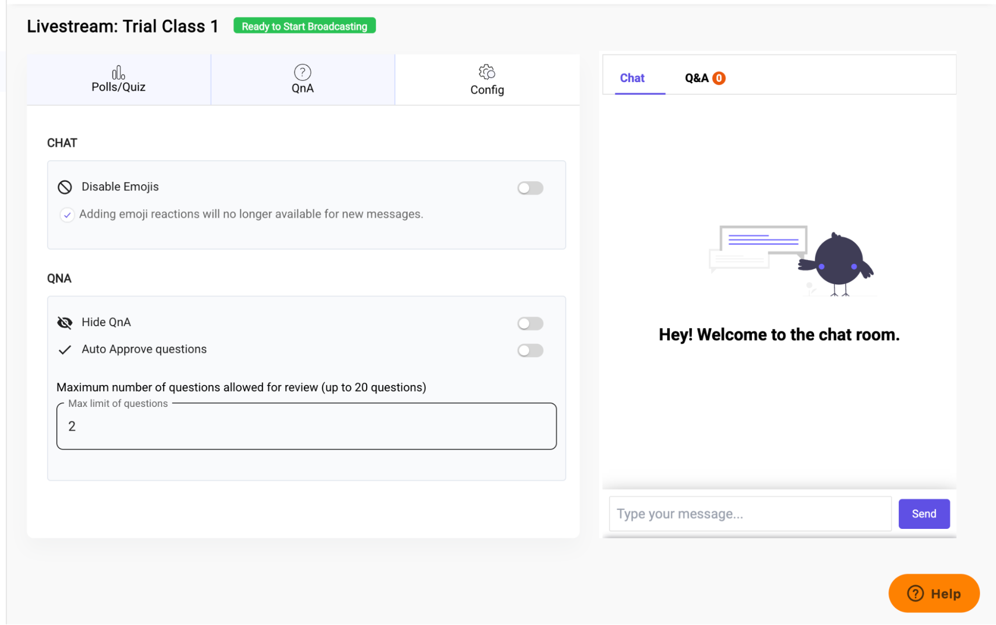 – The “Polls/Quiz” section on right side of dashboard for polls/quizzes which can be saved and used in multiple streams.