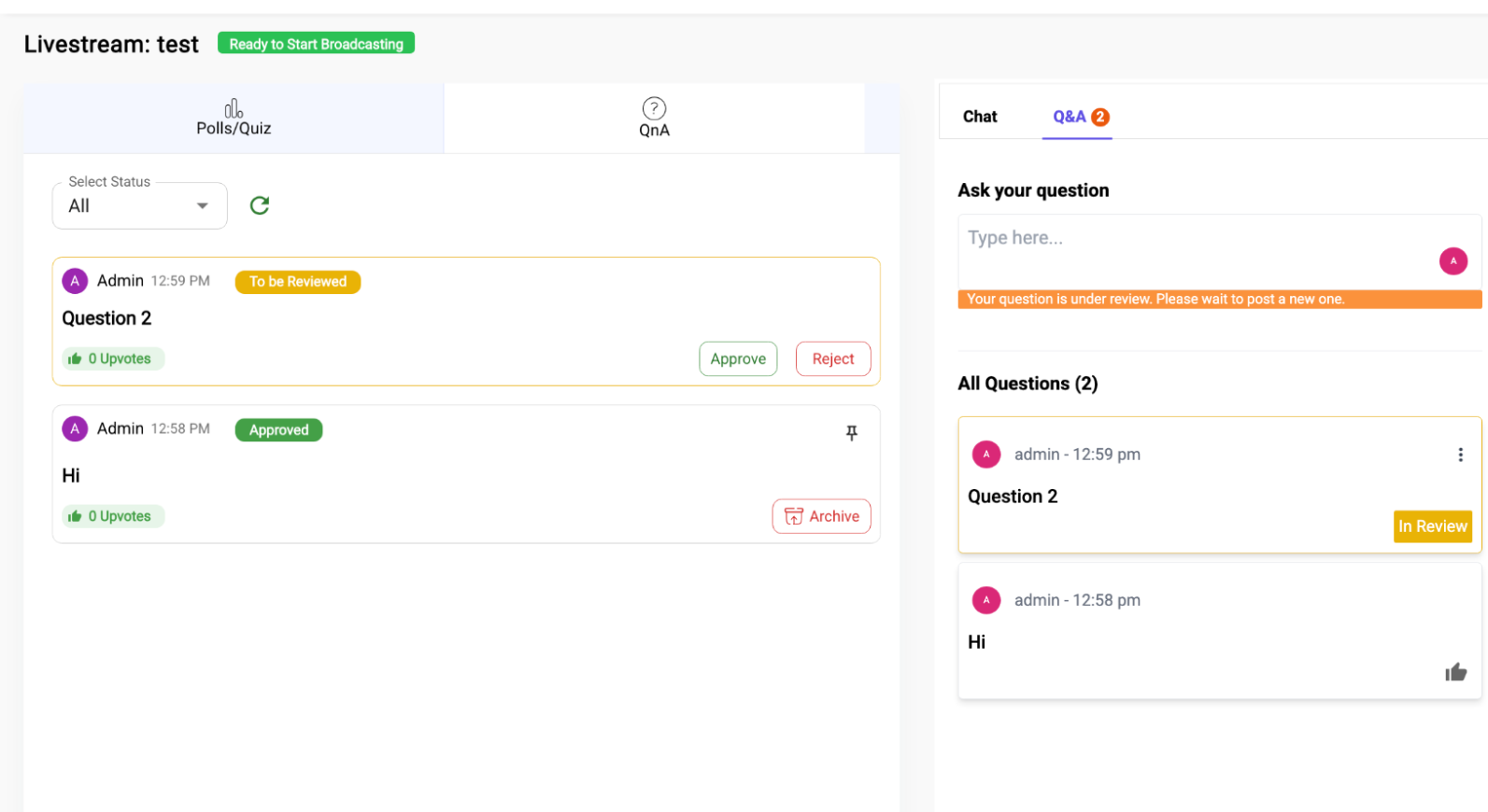 Moderators now have full control to manage question visibility. Every submitted question enters a review stage. After evaluating relevance, tone, and intent, moderators can Approve or Reject the question. Approved questions become part of the live chat or QnA panel for broader audience visibility. Rejected questions remain private and do not disrupt the engagement experience.